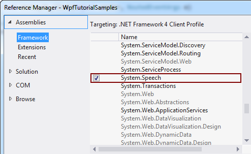 In the previous article we discussed how we could transform text into spoken words, using the SpeechSynthesizer class. In this article we'll go the other way around, by turning spoken words into text. To do that, we'll be using the SpeechRecognition class, which resides in the System.Speech assembly. This assembly is not a part of your solutions by default, but we can easily add it. Depending on which version of Visual Studio you use, the process looks something like this: