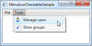 </Window>For this example I've created a secondary top-level item, where I've added two items: One with an icon defined, using the Icon property with a standard Image control inside of it, and one where we use the IsCheckable property to allow the user to check and uncheck the item. I even used the IsChecked property to have it checked by default. From Code-behind, this is the same property that you can read to know whether a given menu item is checked or not.
