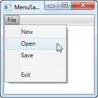 I have defined a single top-level item, with 4 child items and a separator. I use the Header property to define the label of the item, and you should notice the underscore before the first character of each label. It tells WPF to use that character as the accelerator key, which means that the user can press the Alt key followed by the given character, to activate the menu item. This works all the way from the top-level item and down the hierarchy, meaning that in this example I could press Alt, then F and then N, to activate the New item.