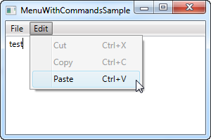 It might not be completely obvious, but by using commands, we just got a whole bunch of things for free: Keyboard shortcuts, text and InputGestureText on the items and WPF automatically enables/disables the items depending on the active control and its state. In this case, Cut and Copy are disabled because no text is selected, but Paste is enabled, because my clipboard is not empty!