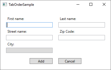 However, for this dialog, that's not the behavior I want. Instead I want to tab from First name to Last name (so basically moving horizontally instead of vertically), and on top of that, I don't want to enter the City field when tabbing through the form, because that will be automatically filled based on the Zip code in this imaginary dialog and has therefore been made readonly. To accomplish all of this, I will use two properties: TabIndex and IsTabStop. TabIndex is used to define the order, while the IsTabStop property will force WPF to skip a control when tabbing through the Window. Here's the markup used to create the dialog: