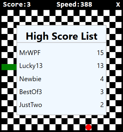 In the previous article, we made a lot of visual improvements to our SnakeWPF implementation. In this article, I would like to add a very cool feature: A high score list! On top of that, I would like to make the game a bit more user-friendly, by adding a welcome screen. I'll also be replacing the very non-gamey "You died"-messagebox with an in-game screen.
