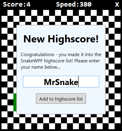 }With all that in place, start the game and do your best - as soon as the game ends, you should hopefully have made it into your brand new SnakeWPF high score list!