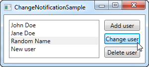 In the final example, which you will find below, we have simply replaced the List<User> with an ObservableCollection<User> - that's all it takes! This will make the Add and Delete button work, but it won't do anything for the "Change name" button, because the change will happen on the bound data object itself and not the source list - the second step will handle that scenario though.
