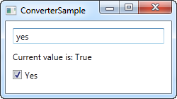 If you try to run this example, you will be able to change the value in two places: By writing "yes" in the TextBox (or any other value, if you want false) or by checking the CheckBox. No matter what you do, the change will be reflected in the other control as well as in the TextBlock.