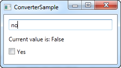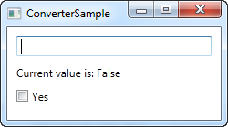 In the XAML part of the program, we start off by declaring an instance of our converter as a resource for the window. We then have a TextBox, a couple of TextBlocks and a CheckBox control and this is where the interesting things are happening: We bind the value of the TextBox to the TextBlock and the CheckBox control and using the Converter property and our own converter reference, we juggle the values back and forth between a string and a Boolean value, depending on what's needed.