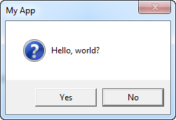 MessageBox.Show("Hello, world?", "My App", MessageBoxButton.YesNo, MessageBoxImage.Question, MessageBoxResult.No);