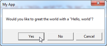 MessageBoxResult result = MessageBox.Show("Would you like to greet the world with a \"Hello, world\"?", "My App", MessageBoxButton.YesNoCancel);
