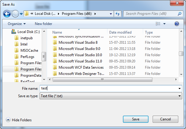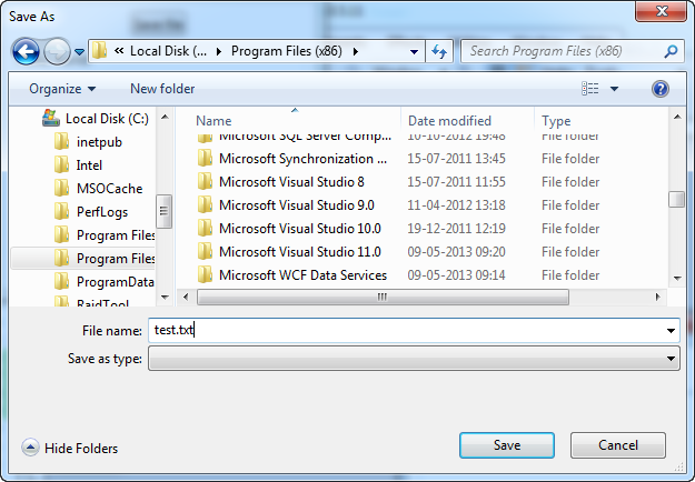 As you can see from the first example, I manually added a .txt extension to my desired filename, mainly because the "Save as type" combo box is empty. Just like for the OpenFileDialog, this box is controlled through the Filter property, and it's also used in the exact same way.