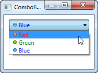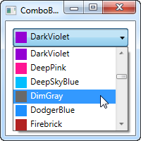 As you can see from the first examples, manually defining the items of a ComboBox control is easy using XAML, but you will likely soon run into a situation where you need the items to come from some kind of data source, like a database or just an in-memory list. Using WPF data binding and a custom template, we can easily render a list of colors, including a preview of the color: