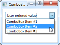 In the first examples, the user was only able to select from our list of items, but one of the cool things about the ComboBox is that it supports the possibility of letting the user both select from a list of items or enter their own value. This is extremely useful in situations where you want to help the user by giving them a pre-defined set of options, while still giving them the option to manually enter the desired value. This is all controlled by the IsEditable property, which changes the behavior and look of the ComboBox quite a bit: