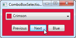 In the third event handler, we use the SelectedItem to select a specific item based on the value. I do a bit of extra work here (using .NET reflection), because the ComboBox is bound to a list of properties, each being a color, instead of a simple list of colors, but basically it's all about giving the value contained by one of the items to the SelectedItem property.