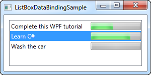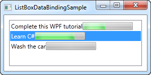All the magic happens in the ItemTemplate that we have defined for the ListBox. In there, we specify that each ListBox item should consist of a Grid, divided into two columns, with a TextBlock showing the title in the first and a ProgressBar showing the completion status in the second column. To get the values out, we use some very simple data binding, which is all explained in the data binding part of this tutorial.