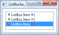 This is as simple as it gets: We declare a ListBox control, and inside of it, we declare three ListBoxItem's, each with its own text. However, since the ListBoxItem is actually a ContentControl, we can define custom content for it: