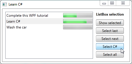 As mentioned, a key difference between the ItemsControl and the ListBox is that the ListBox handles and displays user selection for you. Therefore, a lot of ListBox question revolves around somehow working with the selection. To help with some of these questions, I have created a bigger example, showing you some selection related tricks: