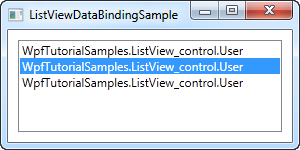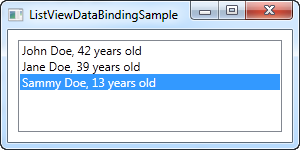 }We populate a list of our own User objects, each user having a name and an age. The data binding process happens automatically as soon as we assign the list to the ItemsSource property of the ListView, but the result is a bit discouraging: