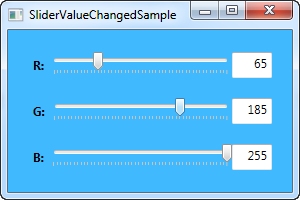 Of course, while bindings are very cool for a lot of purposes, you still may want to respond to changes in the Slider value from your Code-behind. Fortunately for us, the Slider comes with a ValueChanged event which will help us with that. To illustrate this, I've created a more complex sample with three sliders, where we change the Red, Green and Blue (RGB) values of a color: