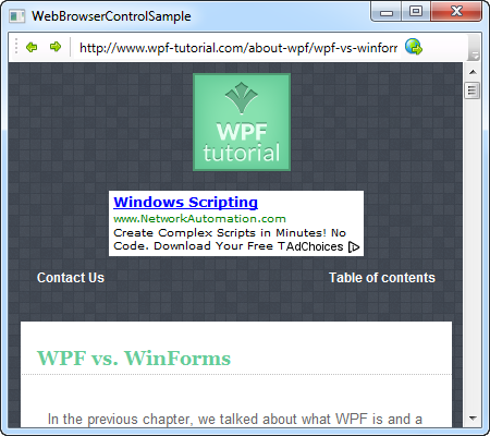 As you can see, hosting and using a complete webbrowser inside of your application becomes very easy with the WebBrowser control. However, you should be aware that the WPF version of WebBrowser is a bit limited when compared to the WinForms version, but for basic usage and navigation, it works fine.