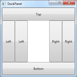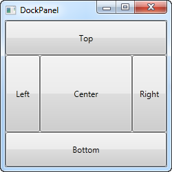The last thing that you will likely notice, is how the space is divided. For instance, the Top button doesn't get all of the top space, because the Left button takes a part of it. The DockPanel decides which control to favor by looking at their position in the markup. In this case, the Left button gets precedence because it's placed first in the markup. Fortunately, this also means that it's very easy to change, as we'll see in the next example, where we have also evened out the space a bit by assigning widths/heights to the child controls: