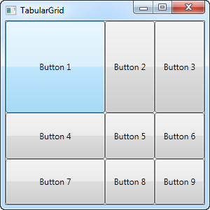 A total of nine buttons, each placed in their own cell in a grid containing three rows and three columns. We once again use a star based width, but this time we assign a number as well - the first row and the first column has a width of 2*, which basically means that it uses twice the amount of space as the rows and columns with a width of 1* (or just * - that's the same).