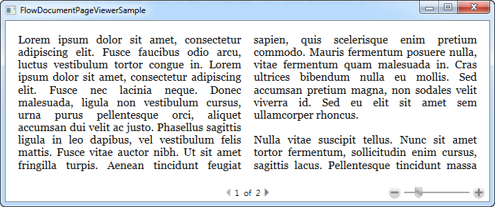 Notice how the long text is cut off, and in the bottom, you can navigate between pages. This is not all that the FlowDocumentPageViewer will do for you though - just look what happens when we make the window wider: