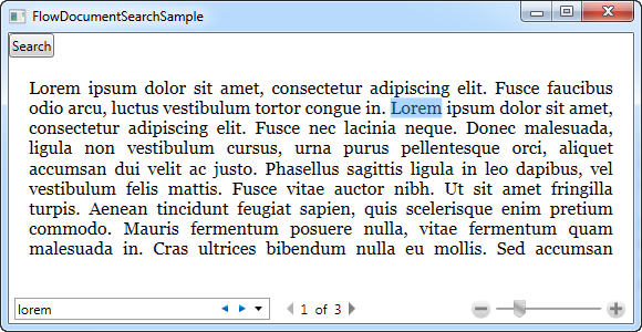 Simply press our dedicated Search button or the keyboard shortcut (Ctrl+F) and you have search functionality in the FlowDocumentPageViewer. As mentioned, this works for both FlowDocumentScrollViewer and FlowDocumentPageViewer (FlowDocumentPageReader has a search button by default), but make sure that the search box has enough horizontal room on the toolbar - otherwise you won't see it when you invoke the Find() command!