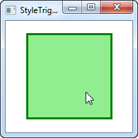 In this example, we have a green square. It has a trigger that fires once the mouse is over, in which case it fires of several animations, all defined in the EnterActions part of the trigger. In there, we animate the thickness of the border from its default 0 to a thickness of 3, and then we animate the width and height from 100 to 125. This all happens simultaneously, because they are a part of the same StoryBoard, and even at slightly different speeds, since we have full control of how long each animation should run.