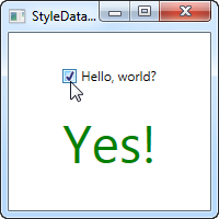In this example, we have a CheckBox and a TextBlock. Using a DataTrigger, we bind the TextBlock to the IsChecked property of the CheckBox. We then supply a default style, where the text is "No" and the foreground color is red, and then, using a DataTrigger, we supply a style for when the IsChecked property of the CheckBox is changed to True, in which case we make it green with a text saying "Yes!" (as seen on the screenshot).
