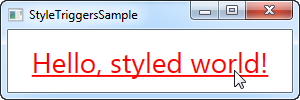 In this style, we set the Foreground property to blue, to make it look like a hyperlink. We then add a trigger, which listens to theIsMouseOver property - once this property changes to True, we apply two setters: We change the Foreground to red and then we make it underlined. This is a great example on how easy it is to use triggers to apply design changes, completely without any code-behind code.