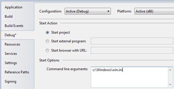 If you run the above example, nothing will happen, because no command-line parameters have been specified. Fortunately, Visual Studio makes it easy to test this in your application. From the Project menu select "[Project name] properties" and then go to the Debug tab, where you can define a command-line parameter. It should look something like this:
