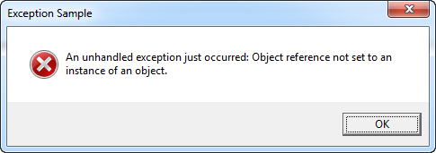 Obviously it will go wrong, since I try to perform the Trim() method on a variable that's currently null. If you don't handle the exception, your application will crash and Windows will have to deal with the problem. As you can see, that isn't very user friendly: