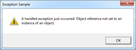 MessageBox.Show("A handled exception just occurred: " + ex.Message, "Exception Sample", MessageBoxButton.OK, MessageBoxImage.Warning);