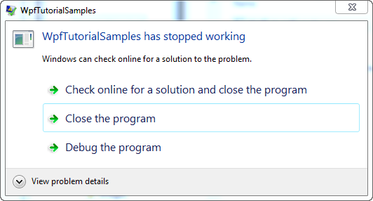 However, sometimes even the simplest code can throw an exception, and instead of wrapping every single line of code with a try- catch block, WPF lets you handle all unhandled exceptions globally. This is done through the DispatcherUnhandledException event on the Application class. If subscribed to, WPF will call the subscribing method once an exception is thrown which is not handled in your own code. Here's a complete example, based on the stuff we just went through: